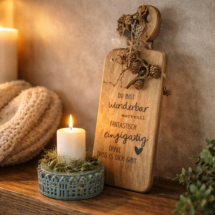 Jedes Produkt wird mit Liebe und Sorgfalt handgefertigt, um Ihrer Geschenkidee eine persönliche Note zu verleihen.